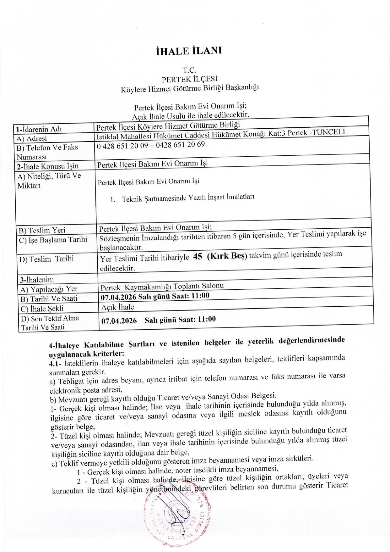 Pertek İlçesi Bakım Evi (Şantiye Binası) Onarım İşi 07.04.2026 Salı günü Saat:11:00’de ihale edilecektir.