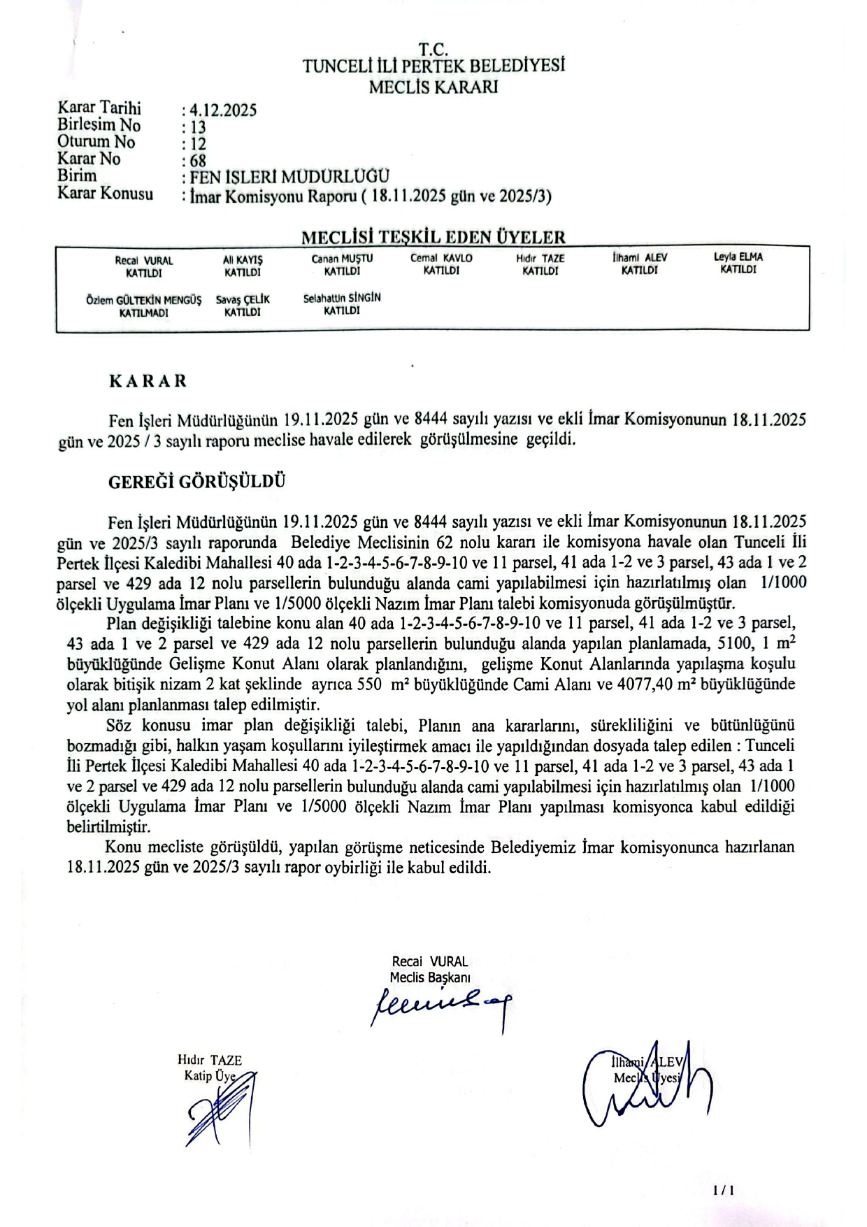 İlçemiz Kaledibi Mahallesi 40 ada 1-2-3-4-5-6-7-8-9-10 ve 11 parsel, 41 ada 1-2 ve 3 parsel, 43 ada 1 ve 2 parsel ve 429 ada 12 parsel nolu taşınmazların bulunduğu alanda 06.03.2025 tarih ve 16 sayılı meclis kararı ile onaylanan 1/5000 Ölçekli Nazım İmar Planı ve 1/1000 Ölçekli Uygulama İmar Planı Tadilatı
